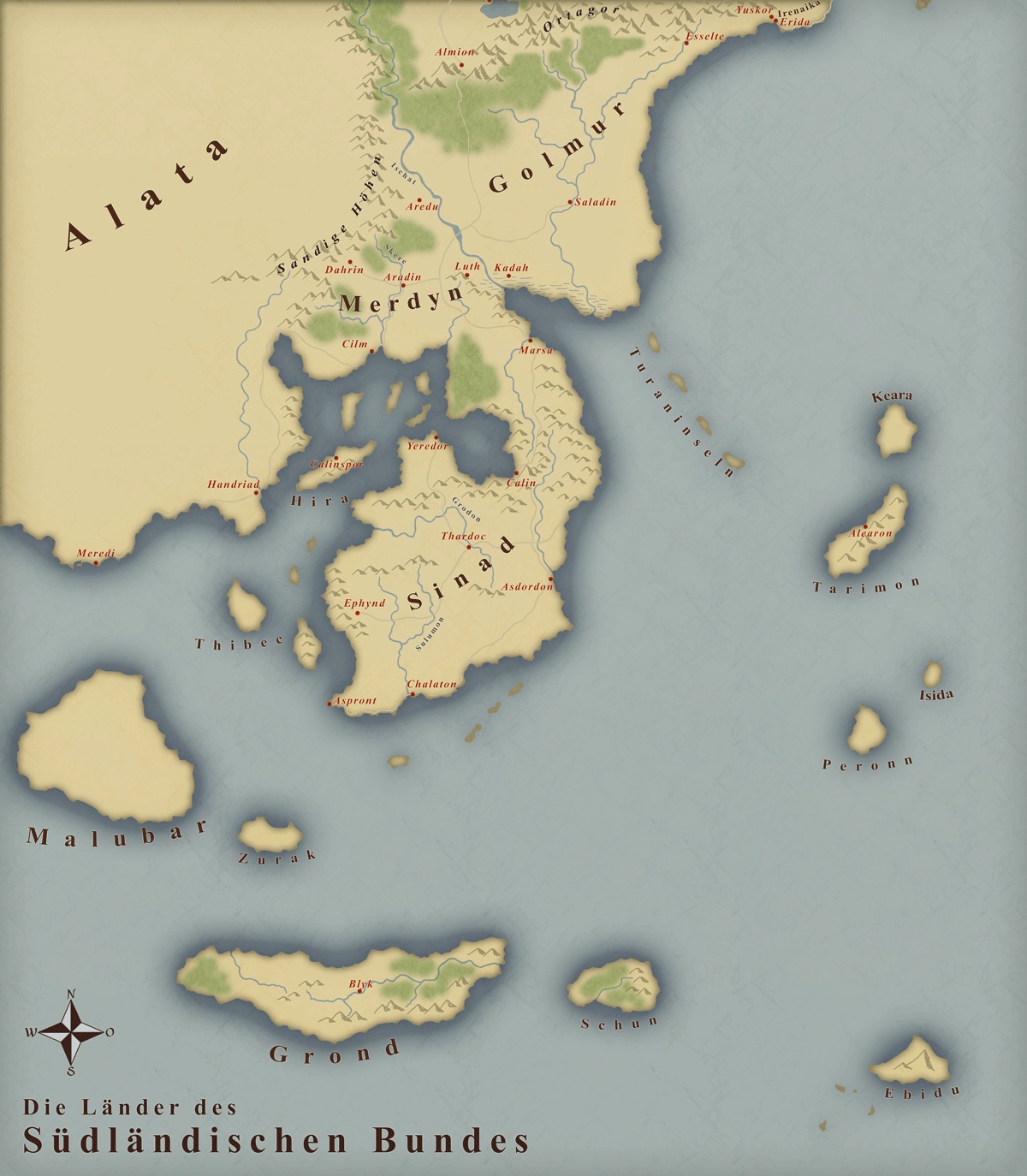 Rund fünfzig Jahre vor dem Großen Krieg schlossen sich die Städte Sinads, das Königreich Merdyn und die Stadt Saladin in Golmur zum Südländischen Bund zusammen, der den ehemaligen Provinzen mehr Gewicht und Stabilität verlieh. Auch die Irenaika trat diesem Bündnis bei, doch fiel sie im Großen Krieg an das Königreich Arn. In jüngerer Zeit haben sich einige Inseln dem Bündnis angeschlossen: Grond und das Königreich Tarimon.